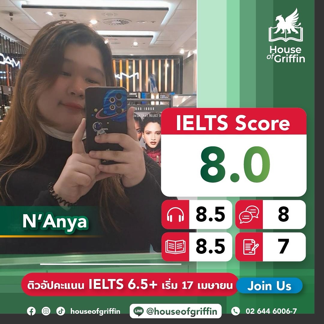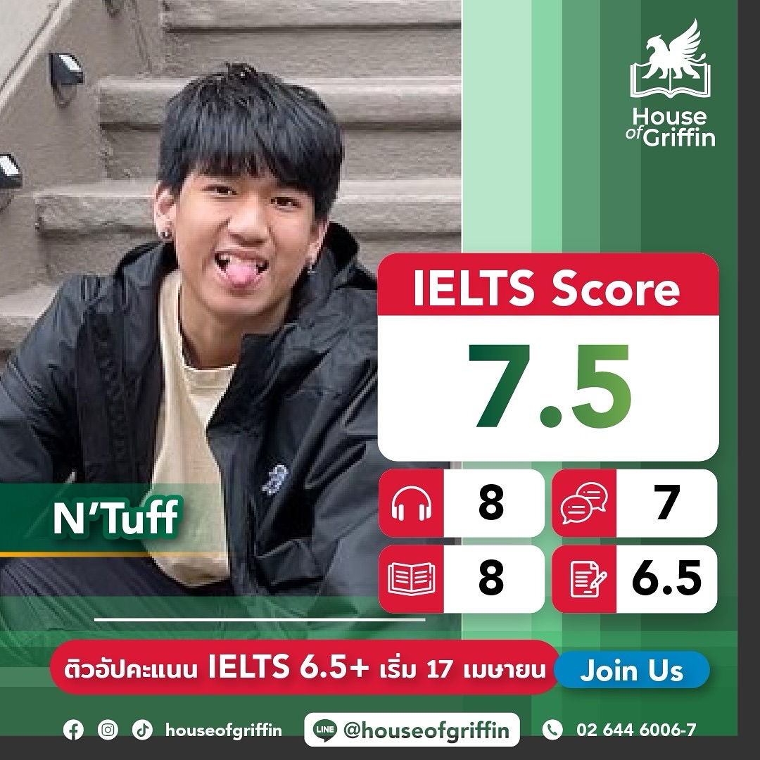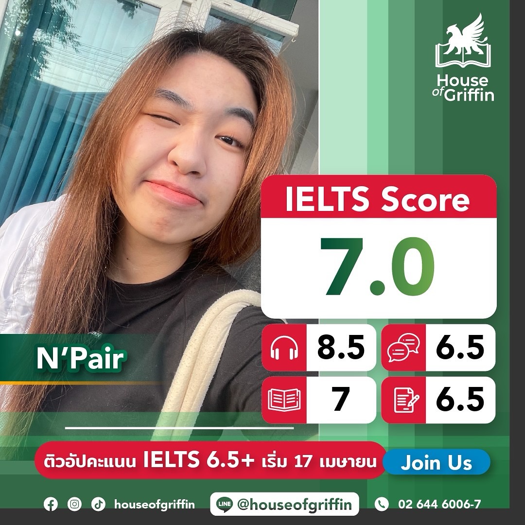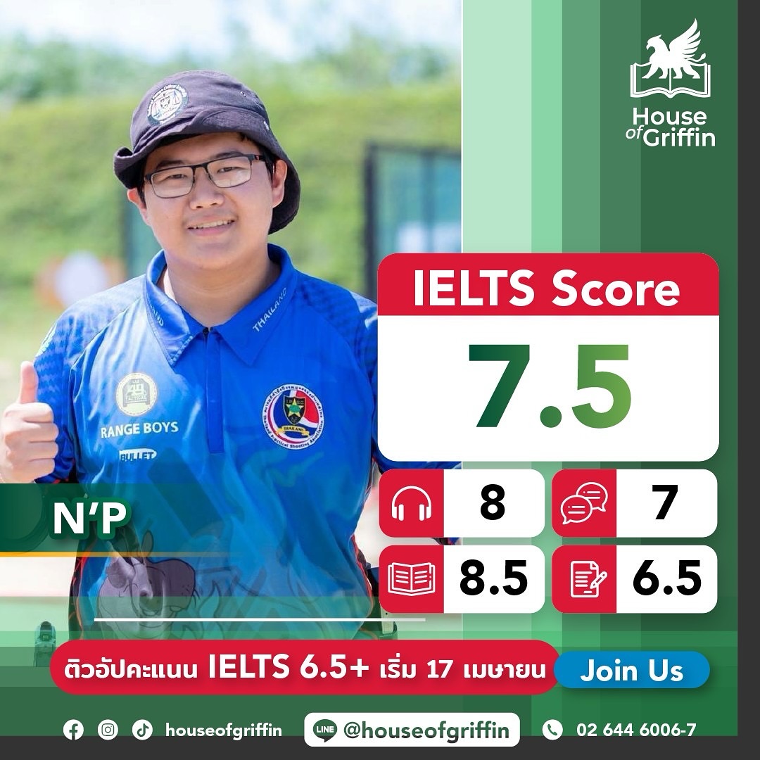 ถ้าน้องคนไหนกำลังมองหาที่เรียน IELTS และยังไม่รู้ว่าจะเรียน IELTS ที่ไหนดี House of Griffin คือคำตอบ ! เพราะคอร์ส IELTS ของเรามีให้เลือกเรียนทั้งคอร์ส IELTS จัดเต็ม 90 ชั่วโมง, คอร์ส IELTS Intensive เน้นตะลุยโจทย์ 56 ชั่วโมง และคอร์ส IELTS Online ติวเข้ม 56 ชั่วโมงเต็ม สอนแบบเข้มข้น เนื้อหาจะครอบคลุมทั้ง 4 ทักษะ ได้แก่ การฟัง (Listening) การพูด (Speaking) การอ่าน (Reading) และการเขียน (Writing) เสริมด้วยไวยากรณ์ (Grammar) และคำศัพท์ (Vocabulary Topics) พร้อมการันตีผลสอบ IELTS 6.0 ขึ้นไปทุกคน (เงื่อนไขเป็นไปตามที่สถาบันกำหนด)