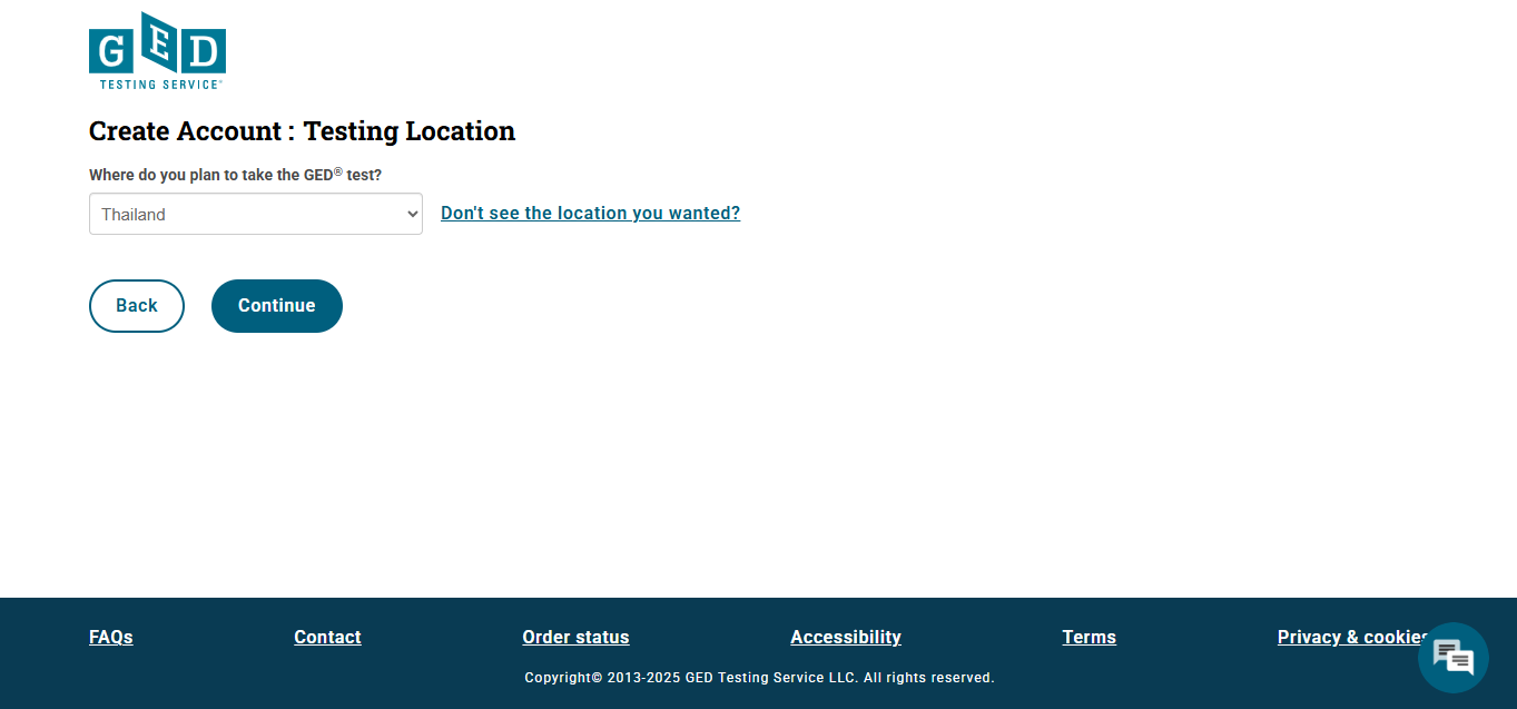 5. เลือกประเทศที่ต้องการสอบ GED (Thailand) และกด Continue ต่อ